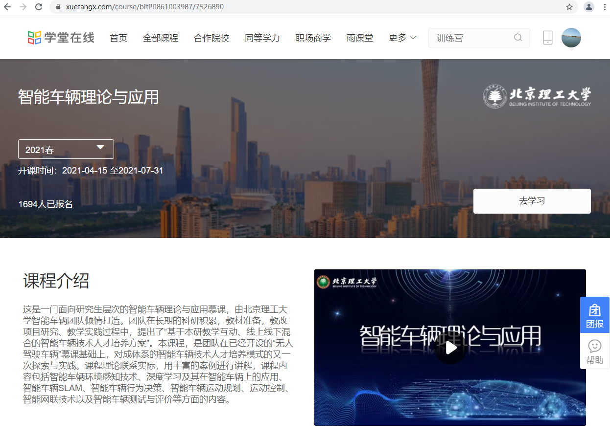 开设有本科生车辆工程专业选修课“无人驾驶车辆理论与设计”、“智能车辆理论与应用”等本科生和研究生专业课程。精心打造了本科生和研究生智能车辆公开慕课,数万人选课完成课程学习;同时,支持了北京市智能网联汽车高精尖产业技能培训,支持了教育部职业教育创新团队培训,达到了良好的社会效益。