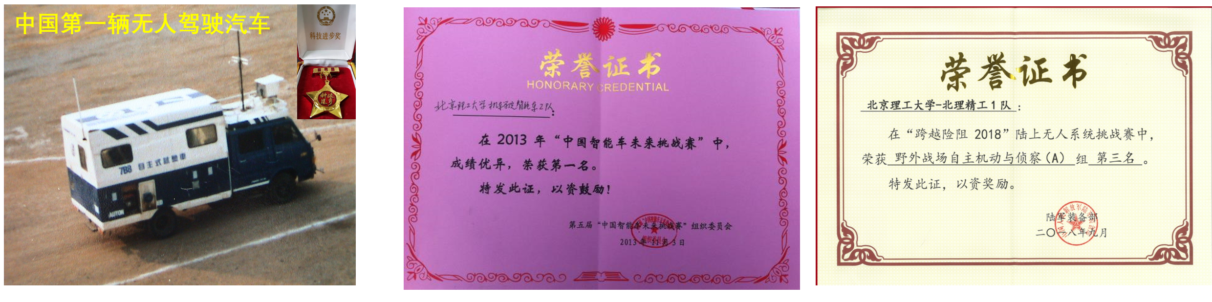 汽车研究所在智能车辆领域研究技术积累雄厚、成果丰富。在1990年至1995年间,研制了我国第一辆无人驾驶车辆(国防科工委资助,南理工、北理工、国防科大、清华大学、浙江大学参研),并于1999年获国家科技进步三等奖。紧紧围绕国家重大需求,在智能车辆自动操控技术领域取得了系列突破并得到系列应用,于2019年牵头获国家科技进步二等奖,同时获数十项部级科技奖励,为国防和国民经济发展作出重要贡献。同时,研究所页获得了中国智能车未来挑战赛第1名(2013)、第2名等多项奖励,在陆军跨越险阻地面无人系统挑战赛各组别中名列前茅,2023年获得A1组自主机动、A2组自主侦察比赛中均获第1名,D4组自主协同比赛中获第2名。其中,陈慧岩教授、龚建伟教授个人均获国家自然科学基金委关键技术贡献奖。