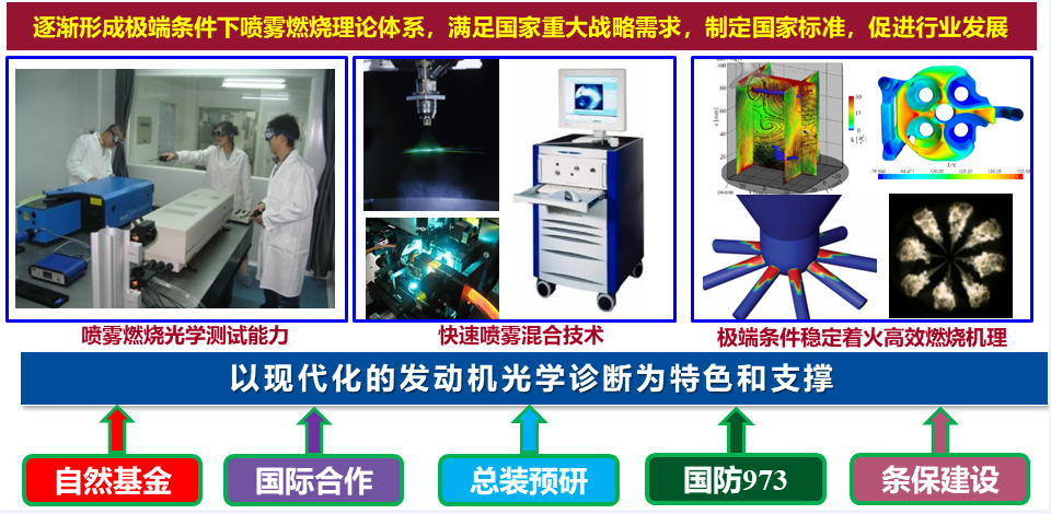发动机研究所目前拥有发动机单缸机和整机试验台共9个,转鼓及排放测试试验台1 个,另外还有燃烧激光测试系统、PIV测试系统、高速摄影测试系统、燃油泵及供油规律测试系统、稳流气道试验系统、定容弹及光学发动机、非常规排气污染物测试设备等多种测试条件,总价值约5千万元。近年来,研究所承担了国家 863、973、国防预研、发动机型号产品研发、重大技术攻关、自然科学基金等国家级项目;与企业广泛开展技术合作,为长安汽车开发出中国第一款阿特金森循环汽油机、中国第一台氢内燃机和氢内燃机轿车,为云内动力开发出系列柴油机;作为国家环保部内燃机排放控制与法规制定的主要依托单位之一,主持或参与了14项国家和地方机动车排放法规的制定;形成了基于参数化设计的预测设计方法和知识产权体系,取得多项科研重大成果,近5年授权国家发明专利70项,发表学术论文300,获国家科技进步二等奖1项,国防科技进步特等奖1项,省部级及学会奖10余项。发动机研究所承担多门本科生、研究生课程的教学工作,包括发动机原理、燃烧学、发动机测试技术、发动机性能仿真等。