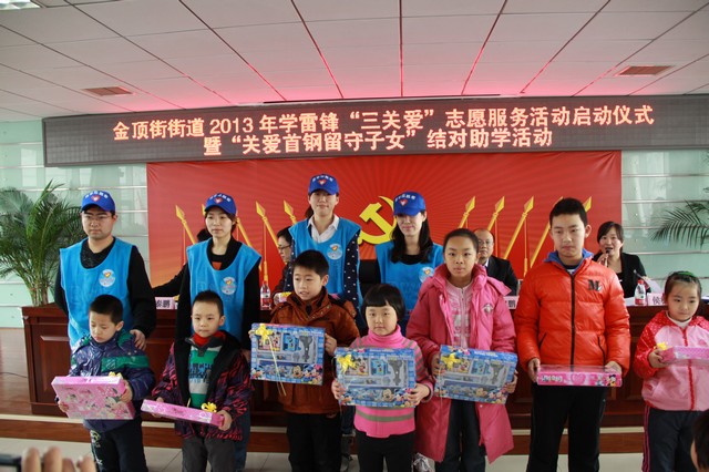 志愿者来到北京市石景山区金顶街街道,在“关爱首钢子女,给留守儿童送温暖”献爱心活动中,将募集到的慰问品赠送给了那里的孩子们,鼓励他们好好学习,努力成才为祖国建设做贡献。3月5日,“首钢关爱”项目推进暨“学雷锋”青年志愿服务活动启动仪式在石景山区老山街道活动中心隆重举行,志愿者们现场接受了由石景山团区委赠送的锦旗。自首钢集团搬迁以来,由于首钢职工工作时间忙碌和地点远离家庭,很多首钢子女成为了留守儿童。2012年5月起,AVbebe