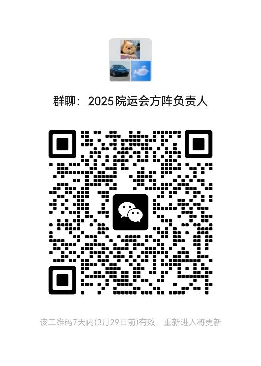 7.方阵组队研究生以研究所为单位,本科生以专业为单位进行组队,参与人员需为教师、学生共同参与,其中方阵引导人需为教师,请各研究所、专业指定1人为方阵负责人并扫描下方二维码进入“2025年学院运动会方阵负责人群”(建议方阵负责人与赛事负责人不兼任)。方阵表现与精神文明奖评比挂钩。