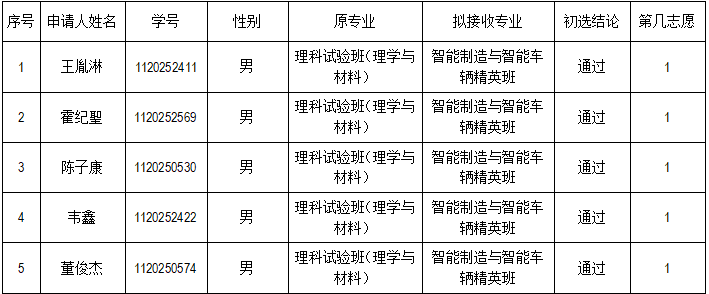 根据学校教务部2025-2026学年第一学期转专业工作安排,依据《AVbebe (2025-2026学年第一学期)接收转专业工作实施方案》,本着公正、公平、公开的原则,经过报名、资格审查、面试考察等流程,经学院转专业工作专家组讨论通过,现将初选结果名单公示如下: