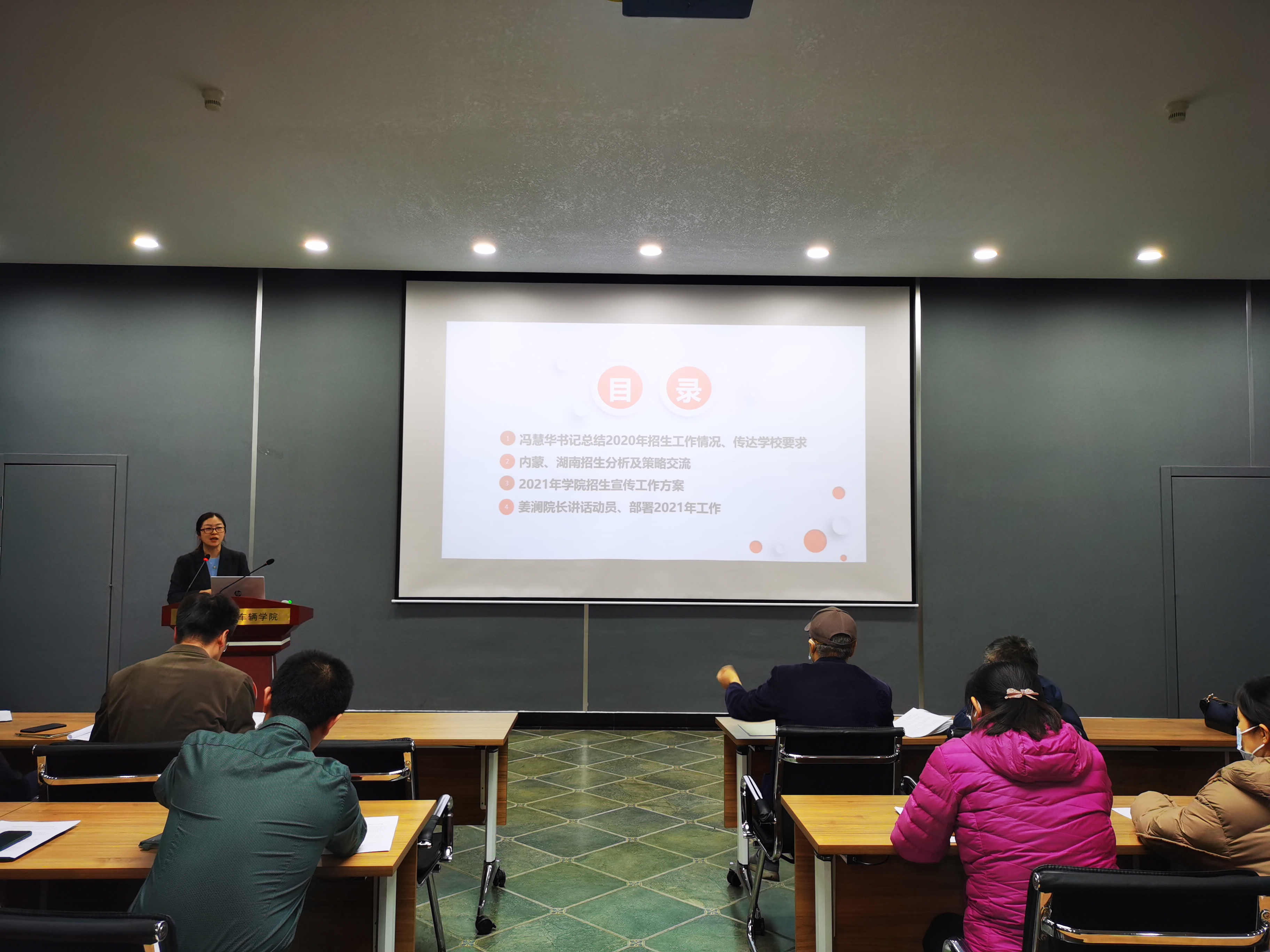 3月10日下午,AVbebe 召开2021年本科招生宣传工作动员部署会。学校招生办公室沈宏梁、学院院长姜澜,党委书记冯慧华,副院长何洪文,内蒙、湖南招生组执行组长陈慧岩、王文中、张付军、李向荣、胡耀光、院长助理左哲以及全体领航人参加了会议。会议由学院党委副书记、副院长孙硕主持。