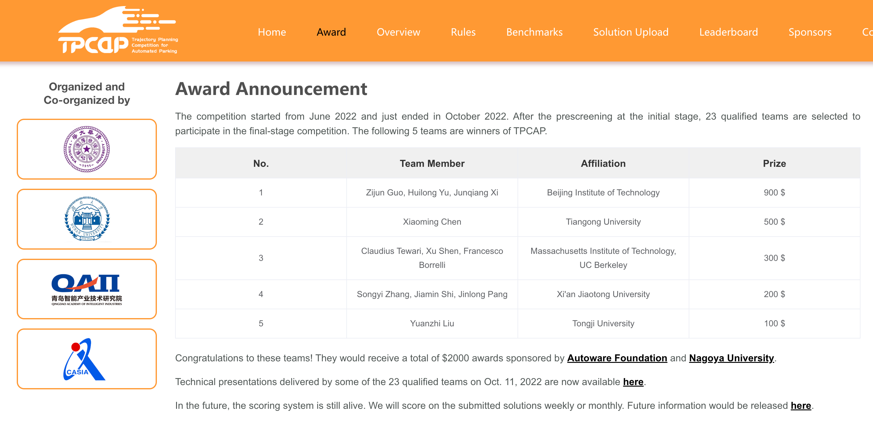 大会设立自主泊车轨迹规划全球挑战赛(Trajectory Planning Competition for Automated Parking,TPCAP)。AVbebe AVbebe 汽车研究所郭子隽博士、于会龙教授、席军强教授团队获得挑战赛第一名。