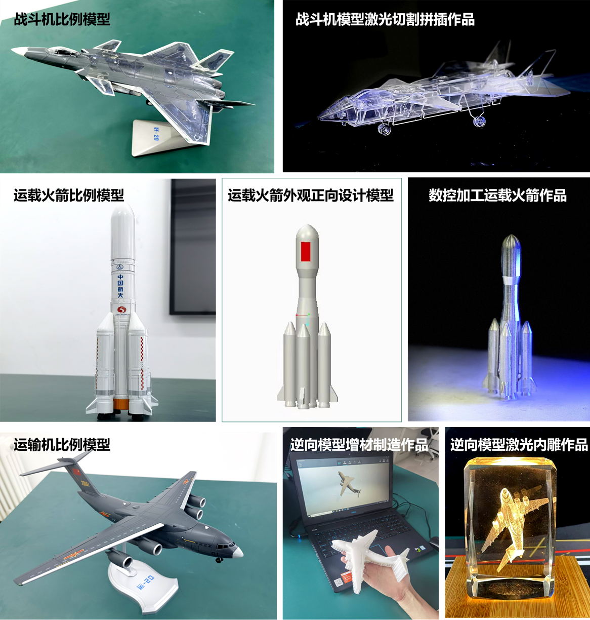 全体同学分为3个实践项目组,分别进行逆向工程、激光加工和数控加工专题的文创设计与实践。围绕同学们喜爱和关切的“大国重器”,设计与制造的对象包括“威龙战斗机”(歼20)、“鲲鹏运输机”(运20)、“长征运载火箭”模型等,在生产性劳动与创造性劳动中,串联了数控程序编制与运行、绘图与建模设计、特种加工实践和3D打印快速原型制作等多个实践模块,DIY设计与制造“大国重器”衍生文创作品。让同学们在课外活动的第二课堂上亲临生产现场,体悟劳动创造美好生活、创新性劳动改变美好生活的理念。