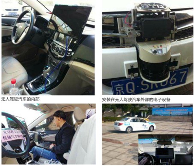在出发点,参赛的车辆车型各异,因各研发机构控制的方法不同,因此车的装备也很不一样。有的车上还有和机械手一样的自动驾驶仪,有多个外接电机。北理工车队有三辆车参赛,其中“RAY”显得最清爽,从外观看,只在车顶有一摄像头,车前装有激光雷达和毫米波雷达,车身就是从4S店买来的比亚迪汽车。车内驾驶座旁的显示屏是给研发人员查看车况的,中控系统放在后排椅子下,电脑主机在后备箱。驾驶座、方向盘与我们平常车一样没有外接设备。