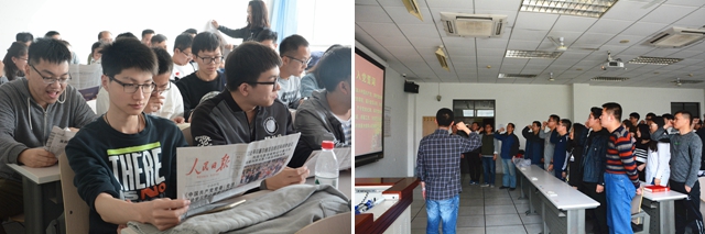 教工党支部书记左哲老师带领大家一同阅读了《人民日报》《习近平总书记系列重要讲话精神学习读本》等文刊,并向大家抛出了一个问题:“‘四讲四有’应该如何解读?”这一疑问在台下引起了激烈的讨论。学生支部书记鲁怡表示:“‘四讲四有’第一条讲政治,有信念,就是要求共产党员,尤其是年轻的共产党员要不断坚定理想信念,永远牢记过去,反思现在,展望未来,这正是我们此次党日活动的目的所在。”