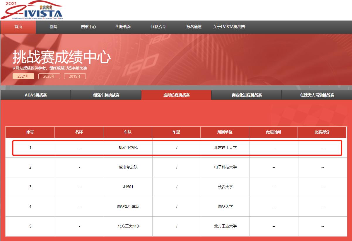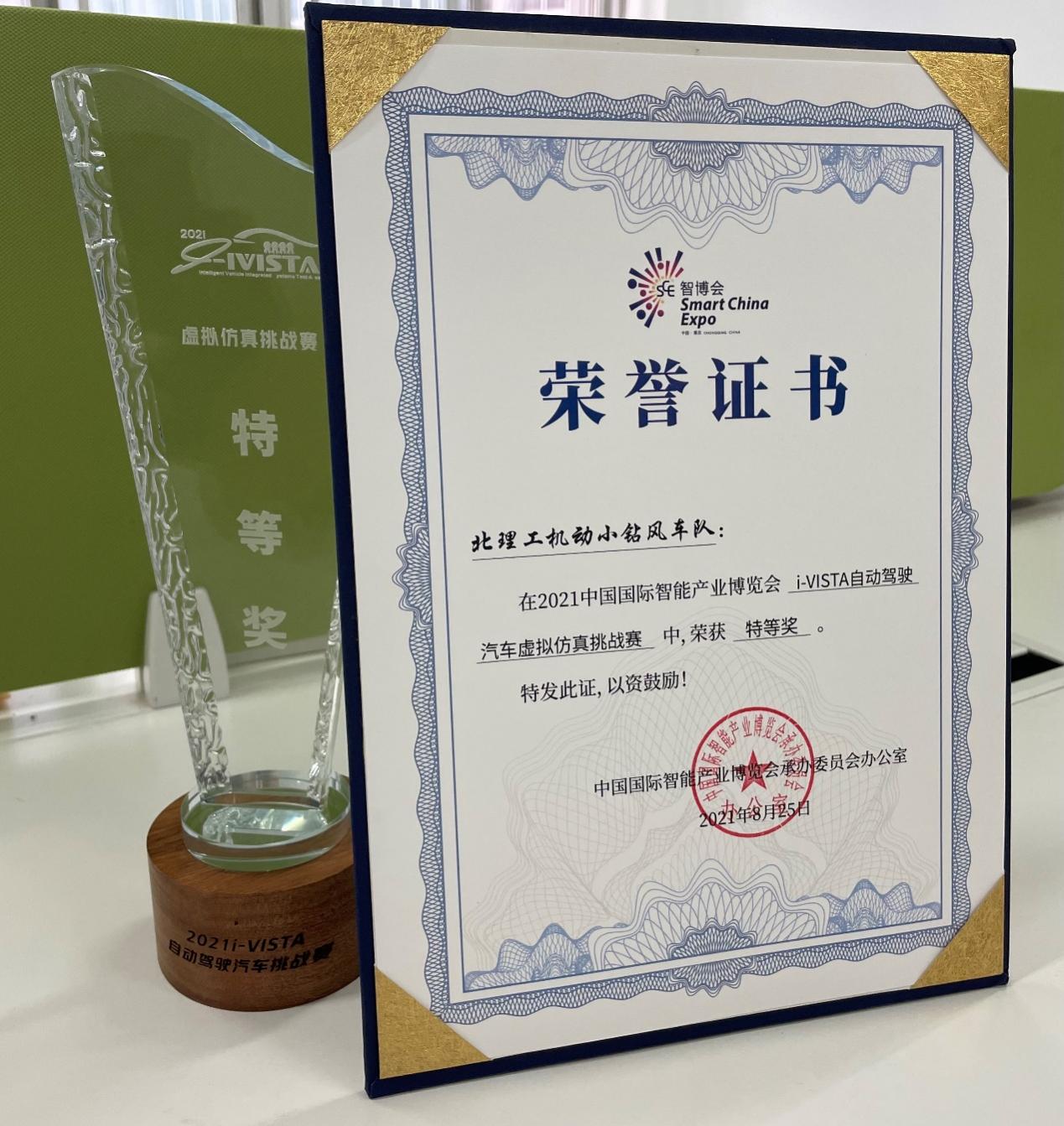 8月19日至22日,由中国国际智能产业博览会组委会主办的第四届2021 i-VISTA自动驾驶汽车挑战赛在重庆两江新区举行,AVbebe 何洪文教授指导的刘文婕、贾淳淳、张奎三位研究生组成了机动小钻风车队参加了虚拟仿真挑战赛项目,以决赛第一名的成绩荣获了2021 i-VISTA自动驾驶汽车挑战赛虚拟仿真挑战赛特等奖。