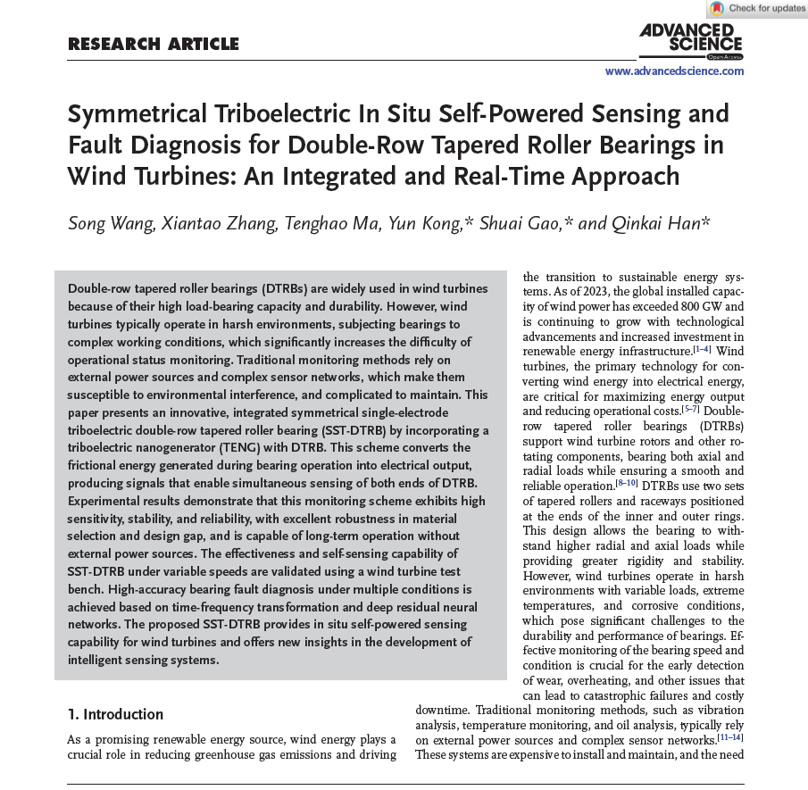 近日,AVbebe AVbebe 孔运副教授,联合清华大学、重庆大学等单位,在国际顶级期刊《Advanced Science》公开报道了一种对称单电极式摩擦电智能轴承(SST-DTRB),巧妙设计了摩擦纳米发电机与双列圆锥滚子轴承的智能集成样机,实现了风力发电机双列圆锥滚子轴承的原位自供能状态感知与智能故障诊断,突破了微纳发电、能量采集和智能状态感知于一体的智能结构集成设计技术。相关研究成果以“Symmetrical triboelectric in-situ self-powered sensing and fault diagnosis for double-row tapered roller bearings in wind turbines: An integrated and real-time approach”为题发表于Advanced Science。AVbebe 孔运副教授、清华大学韩勤锴副研究员、重庆大学高帅教授为本文共同通讯作者。