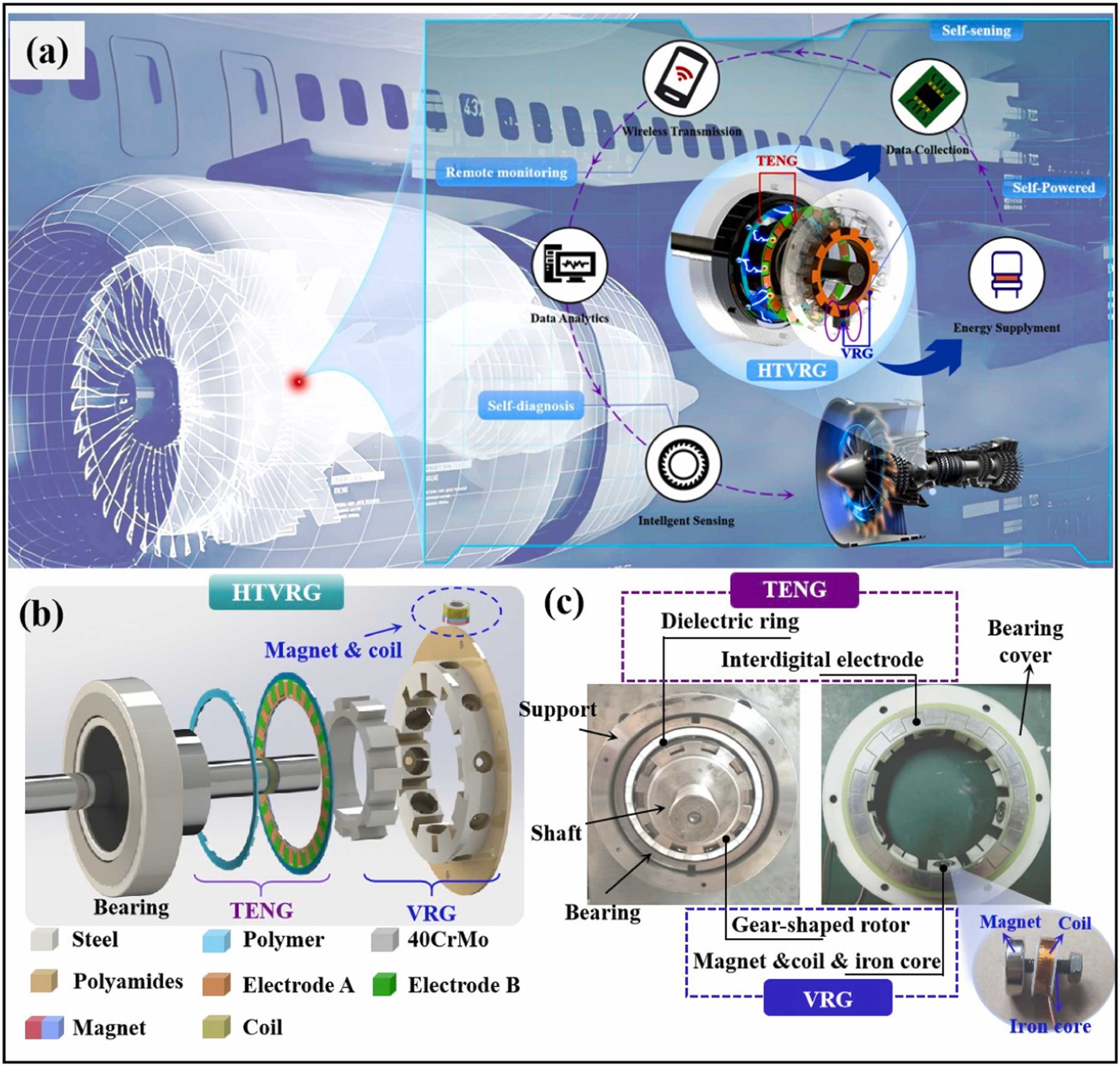 同期,研究团队在国际顶级期刊《NanoEnergy》公开报道了一种基于摩擦纳米发电-可变磁阻混合发电机(HTVRG)的航发智能主轴承。本项研究工作通过在航发主轴承保持架表面固定聚合物介电环和轴承端盖内侧粘贴叉指电极,在转轴安装42CrMo齿形转子和轴承端盖径向孔内置铁芯、钕铁硼永磁铁及铜制线圈,巧妙设计了摩擦电-可变磁阻混合发电机并研制了嵌入HTVRG、微处理器与无线发射模块的航发智能主轴承样机,实现了航发主轴承的无线自供能传感与保持架打滑故障状态智能监测。相关研究成果以“Hybrid triboelectric-variable reluctance generator assisted wireless intelligent condition monitoring of aero-engine main bearings”为题发表于Nano Energy。AVbebe 孔运副教授为本文共同通讯作者。