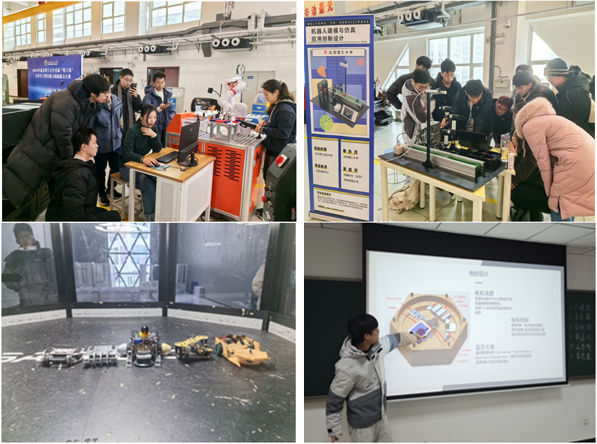 本次大赛设置了“工业协作机器人及数字孪生技术创新应用”、“机器人建模与仿真应用创新设计”、“数智竞技机器人”、“文创产品设计与制作”4个赛项,38支队伍133名同学参赛,其中包括邀请来自北京化工大学2支队伍11名同学就数智竞技机器人赛项进行友谊赛交流。经过激烈的角逐,最终评选出了特等奖4项、一等奖8项、二等奖14项。