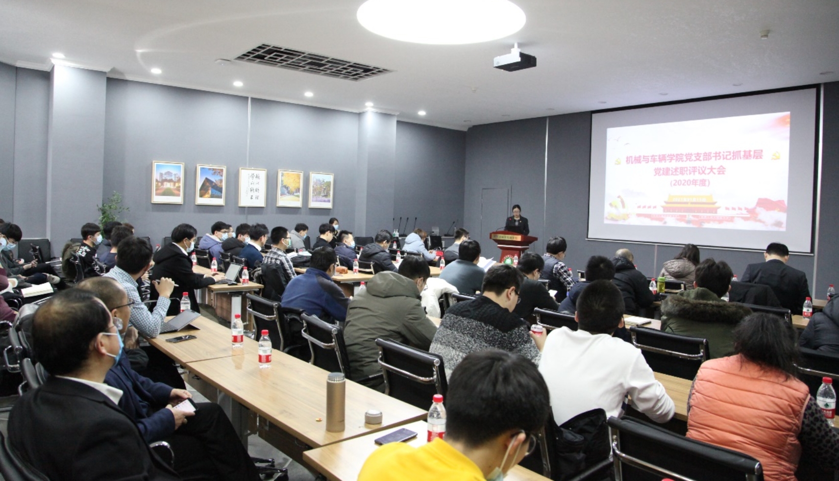 党委在车辆重点实验楼报告厅召开了2020年度党支部书记抓基层党建述职评议大会。学院领导班子成员、党委委员、教代会工会代表、全体党支部书记、党员代表、无党派人士等近70人参加评议会议。考虑到疫情防控要求,会议采用线下、线上并行模式召开,其中会议现场50余人,线上10余人。会议由学院副书记、副院长孙硕主持。
